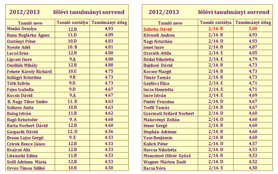 Szeretem a legjobbak listáját nézegetni. Jó látni, hogy sok diáknak bérelt helye van itt, ők folyamatosan jó teljesítményt nyújtanak. A korábbi táblázatokat böngészve feltűnik, hogy néhányan most nem kerültek a legjobban közé. Örömmel olvastunk viszont új neveket a listán. A legnehezebb dolguk talán a kilencedikeseknek volt, akik az iskolaváltás nehézségeit leküzdve sikeresen szerepeltek és a legjobbak közé jutottak, őket külön is köszöntjük.