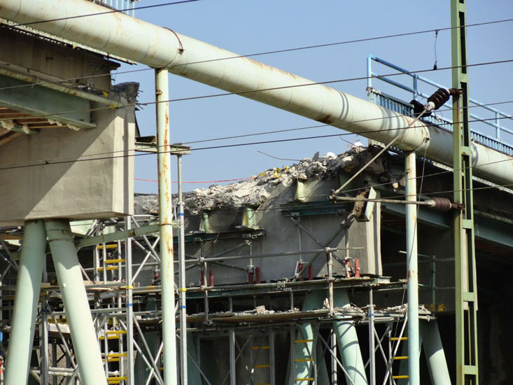 Múlt hét szombaton a délelőtti órákban vízműsök kisebb csoportja gyűlt össze a békéscsabai vasútállomásnál, hogy megfigyelje az Orosházi úti felüljáró bontási munkálatait. A teljes hétvégén át tartó vágányzár lehetővé tette, hogy a sínekről figyeljük az eseményeket. Szerencsére jó időt fogtunk ki. A helyszínre érkezve a Közgép építésvezetője, Czaga Róbert bemutatta nekünk a híd alapjait készítő cölöpfúrógépet. Láttuk, hogyan törik fel a 35 cm-es betonréteget, és azt is, hogyan emelik ki az acélgerendákat 200 tonna teherbírású daruval. A bontási munkák ideje alatt a vágányokat fóliával takarták le, hogy az ágyazat ne szennyeződjön. Láttunk cölöpöző gépet, amely 60 m hosszú cölöpöket fog készíteni.
