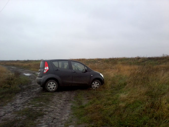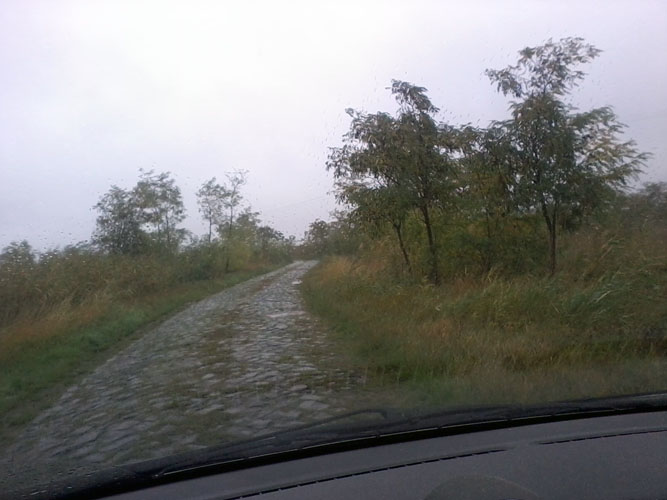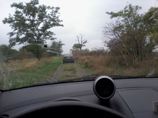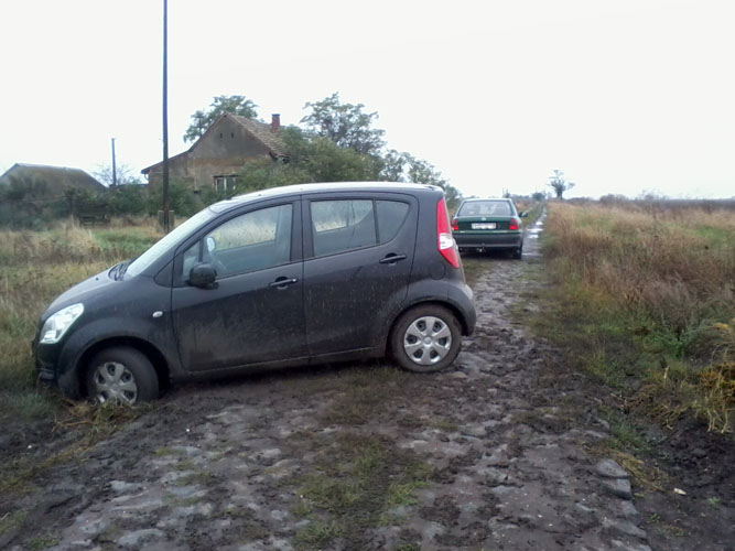 30-40 km/órás sebességgel „zakatoltam” úgy negyedórán át, időnként fényképezgettem. Éppen megpillantottam a célba vett település szélső házait, amikor hirtelen újabb meglepetés ért: véget ért a kőburkolat! Földút következett, és a dagonyázás lehetősége. Ehhez már nem éreztem kedvet, így megpróbáltam visszafordulni. Az út keskenynek bizonyult, az első kerekek sárba mélyedtek, s csak pörögtek, pörögtek hatástalanul. Leragadtam. Félórán át igyekeztem kikecmeregni a dagonyából – nedves gazcsomó, némi kóró és tégladarabok segítségével, ám kudarcot vallottam. „Külső” segítségre szorultam. Felhívtam egy derék ismerősömet, akiről tudtam, hogy a közeli (30 km-re lévő) városban tartózkodik. Röpke tanakodás után vállalta a mentőangyal szerepét, vásárolt egy vontatókötelet, s nekieredt a „bogárhátas” út és a lecövekelt autó irányába. Hamarosan örömmel pillantottam meg „zöld angyalomat”, aki remek hozzáértésével kiugrasztotta járgányomat fogságából. Köszönöm!