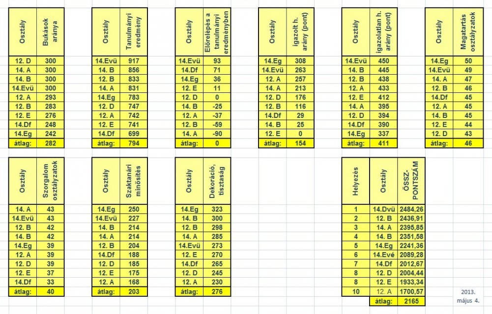 Érdemes küzdeni, hiszen az I.-II. és III. helyezett osztályok egy szabadnapot kapnak kirándulásra és ehhez anyagi támogatásban is részesülnek. A versennyel csak nyerni lehet, hiszen az értékelés szempontjai az iskolában a legfontosabbak: a tanulmányi eredmény, a javítás mértéke, a diákok magatartása és szorgalma, a tantermek tisztasága, a szaktanárok értékelése, stb. Mivel a 12. és 14. osztályosok számára április végén befejeződik a tanév, ők külön versenyeznek senior kategóriában. Ballagáskor kihirdettük a végeredményt és a győztes osztályok máris szervezik a programot!