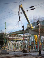 Múlt hét szombaton a délelőtti órákban vízműsök kisebb csoportja gyűlt össze a békéscsabai vasútállomásnál, hogy megfigyelje az Orosházi úti felüljáró bontási munkálatait. A teljes hétvégén át tartó vágányzár lehetővé tette, hogy a sínekről figyeljük az eseményeket. Szerencsére jó időt fogtunk ki. A helyszínre érkezve a Közgép építésvezetője, Czaga Róbert bemutatta nekünk a híd alapjait készítő cölöpfúrógépet. Láttuk, hogyan törik fel a 35 cm-es betonréteget, és azt is, hogyan emelik ki az acélgerendákat 200 tonna teherbírású daruval. A bontási munkák ideje alatt a vágányokat fóliával takarták le, hogy az ágyazat ne szennyeződjön. Láttunk cölöpöző gépet, amely 60 m hosszú cölöpöket fog készíteni.